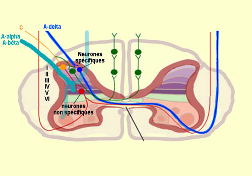 de la corne dorsale où les différentes fibres (A-alpha, bêta,