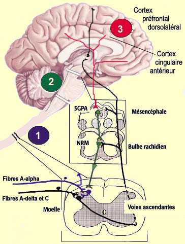 du circuit nociceptif menant au cerveau (le numéro 2 bleu dans le schéma