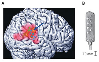 Source : Dirk De Ridder et al., http://content.nejm.org/cgi/content/full/357/18/1829 Sur la partie A de la figure, les carrés représentent la position des électrodes sur la région temporopariétale de l'hémisphère droit. Les carrés bleus représentent les électrodes inactives et les carrés verts les électrodes actives durant l'effet ressenti par le patient. Les zones en jaune illustrent l'activité cérébrale maximale enregistrée par le PET scan durant l'expérience (la jonction du gyrus angulaire et du gyrus supramarginal dans le cas de la flèche). La partie B montre l'électrode de stimulation utilisée.