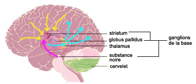 aux ganglions de la base. Celle-ci enverrait une décharge du neurotransmetteur